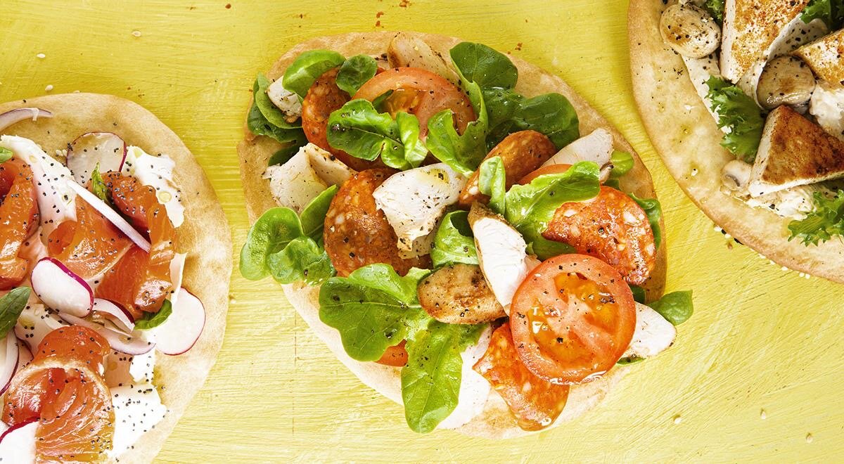 Шаг 3: Лепешки слегка подогрейте на сухой сковороде. На каждую уложите куриный фарш, помидоры, перцы и пепперони. Добавьте листья салата и подавайте горячими.