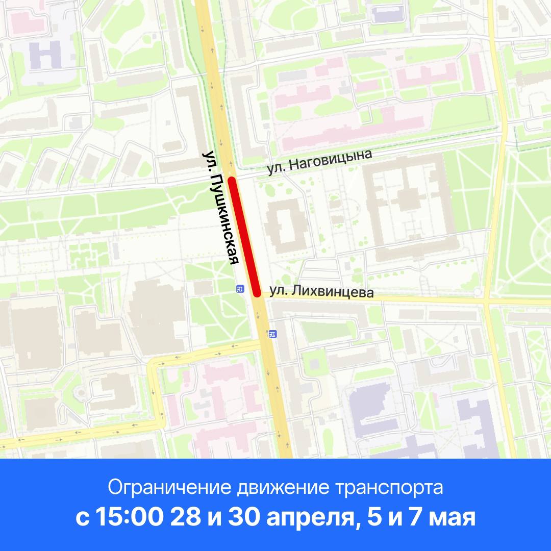 Также 28 и 30 апреля, 5 и 7 мая с 15:00 будет запрещена парковка на ул. Пушкинская от ул. Наговицына до ул. Лихвинцева.