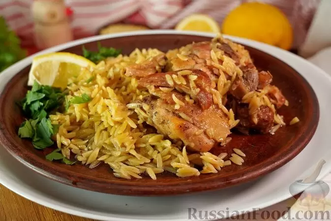 - Курица с орзо — нежное мясо, тушеное в насыщенном бульоне с ароматными травами и лимонным соком, подается с пастой орзо, напоминающей рис.