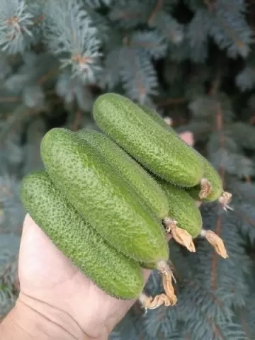 Плоды этого гибрида имеют цилиндрическую форму и оптимальные размеры для консервирования — до 11 см в длину. Их насыщенный зеленый цвет и мелкие бугорки делают их привлекательными для потребителей. Их плотная мякоть обладает хрустящей текстурой и идеальна для салатов и заготовок.