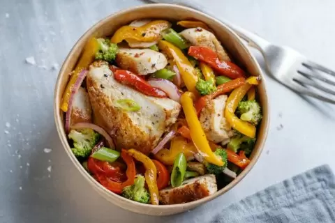 Курица с овощами: Обжарить куриную грудку, добавить замороженные овощи и тушить все под крышкой с любимыми специями.