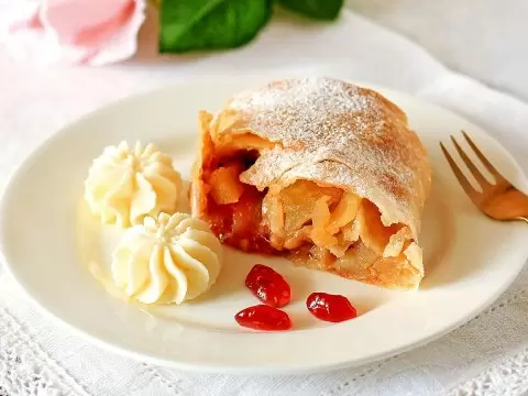 Выпекаем при температуре 180°C на протяжении 25-30 минут. Как только штрудель приобретет золотистый оттенок, его следует достать из духовки и посыпать сахарной пудрой для дополнительной сладости. Получается идеальный десерт с хрустящими краями и сочной начинкой, который прекрасно сочетается с взбитыми сливками или просто так.