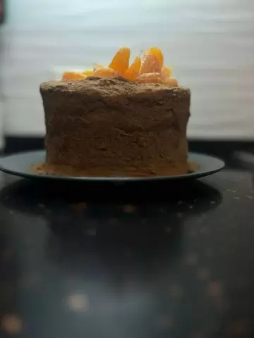 При подаче получите удовольствие от тщательно укрытого слоя торта крошкой, посыпьте сверху какао и украсьте свежими мандаринами. Этот торт не только порадует глаз, но и станет основным акцентом новогоднего праздничного стола!