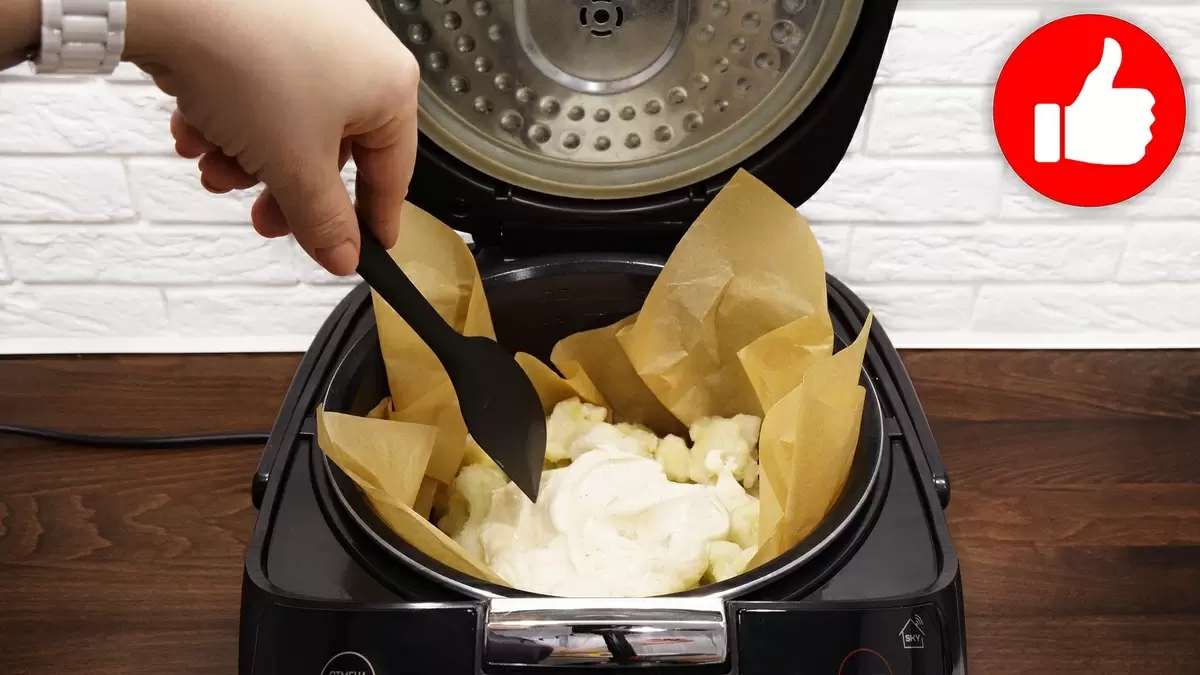 Для начала смешайте сметану с мукой, горчицей и специями в отдельной миске. Затем достаньте цветную капусту из морозилки за 10-15 минут до готовки, чтобы она немного разморозилась. Внутрь чаши мультиварки уложите бумагу для выпечки, затем выложите капусту и полейте её приготовленной сметаной. Все ингредиенты хорошо перемешайте, добавьте сливочное масло.
