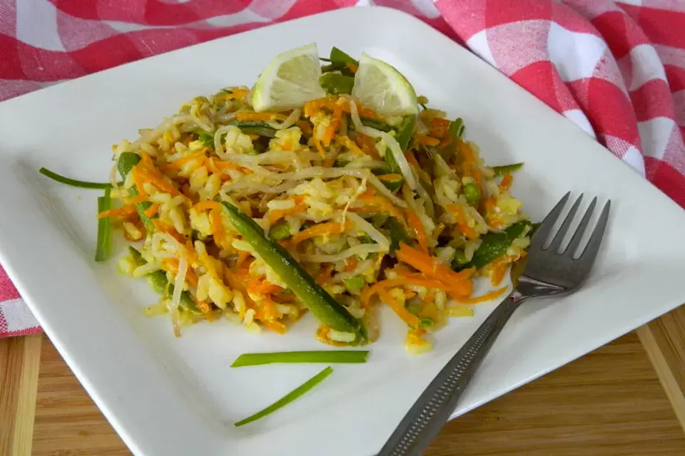 Первым делом рис следует отварить и дать ему остыть. Пока он охлаждается, стоит заняться овощами: мелко нарезать зелёный лук, очистить морковь и нарезать её соломкой. Обычную луковицу тоже следует нарезать на кубики, а чеснок мелко порубить. Из одного лайма необходимо выжать сок, а второй — нарезать на дольки. Яйца взбиваются в отдельной посуде.