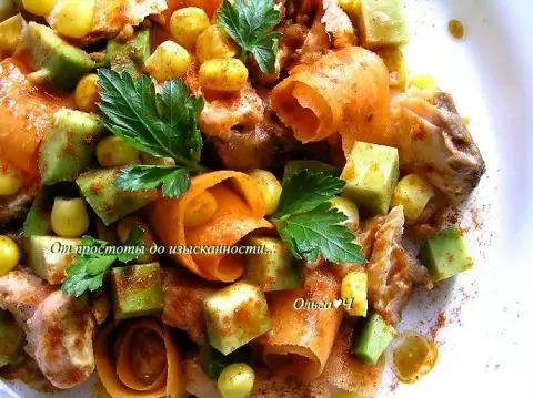 На тарелках выкладываются кусочки лосося, морковь, авокадо и кукуруза. Полейте салат оставшейся заправкой, посыпьте паприкой и украсьте свежей петрушкой. Идеальный баланс вкусов и красок обеспечит незабываемые моменты за столом.
