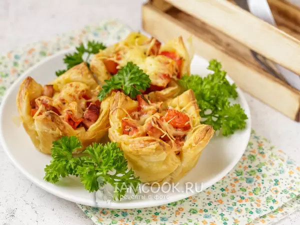 - Корзиночки из слоёного теста: просто раскатать тесто, нарезать и запекать в формочках. Начинить помидорами, перцем, ветчиной и сыром.