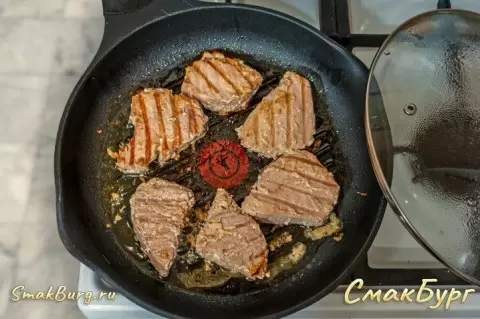 Пока тунец пропитывается вкусом, сковорода-гриль разогревается, добавляется растительное масло, и на среднем огне обжариваются кусочки тунца. Каждый кусок следует перевернуть один раз, чтобы достичь румяности и красивого гриль-узора.