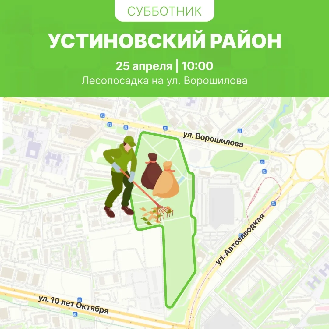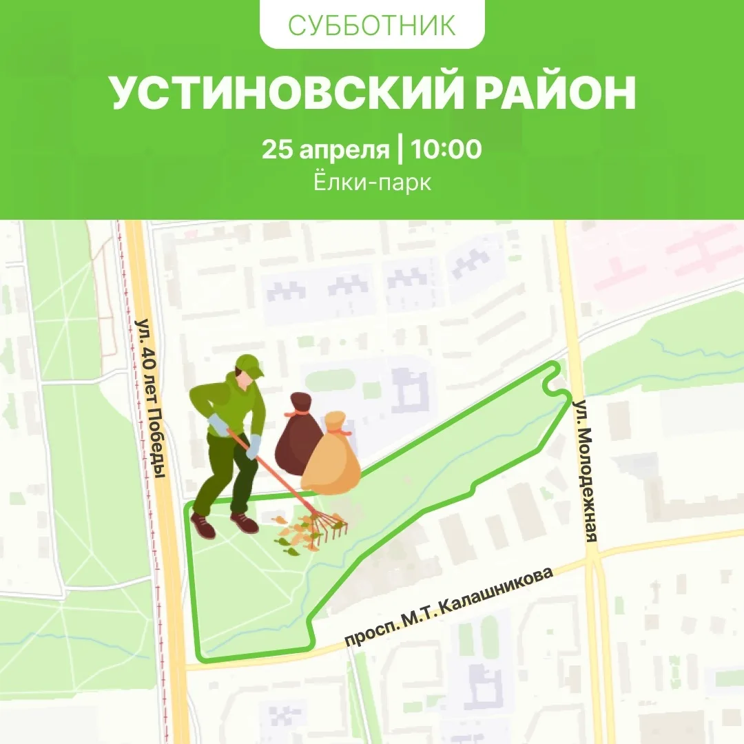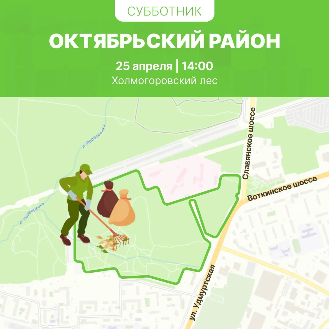 В Устиновском районе с 10:00 субботники пройдут в лесопосадке на ул. Ворошилова, за бывшим ТЦ «»Столица», и в Ёлки-парке.