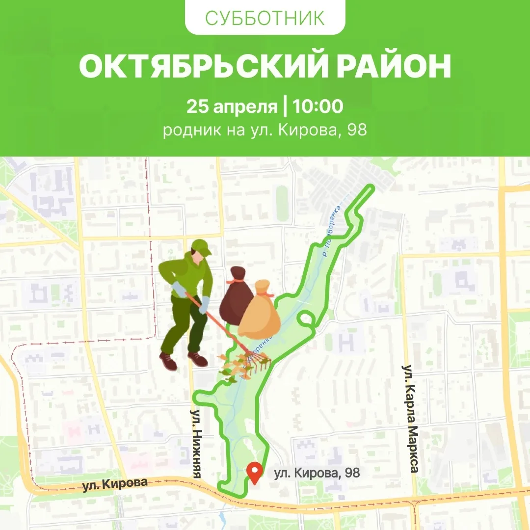 В Октябрьском районе очистят от мусора территорию у родника на ул. Кирова. Сбор у дома № 98 в 10:00. А в 14:00 - субботник в Холмогоровском лесу.