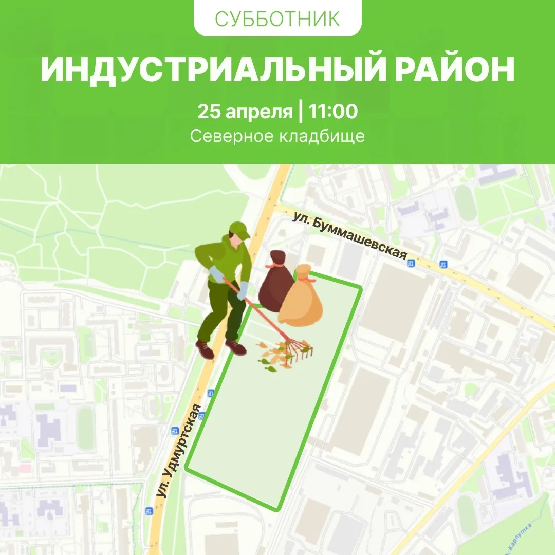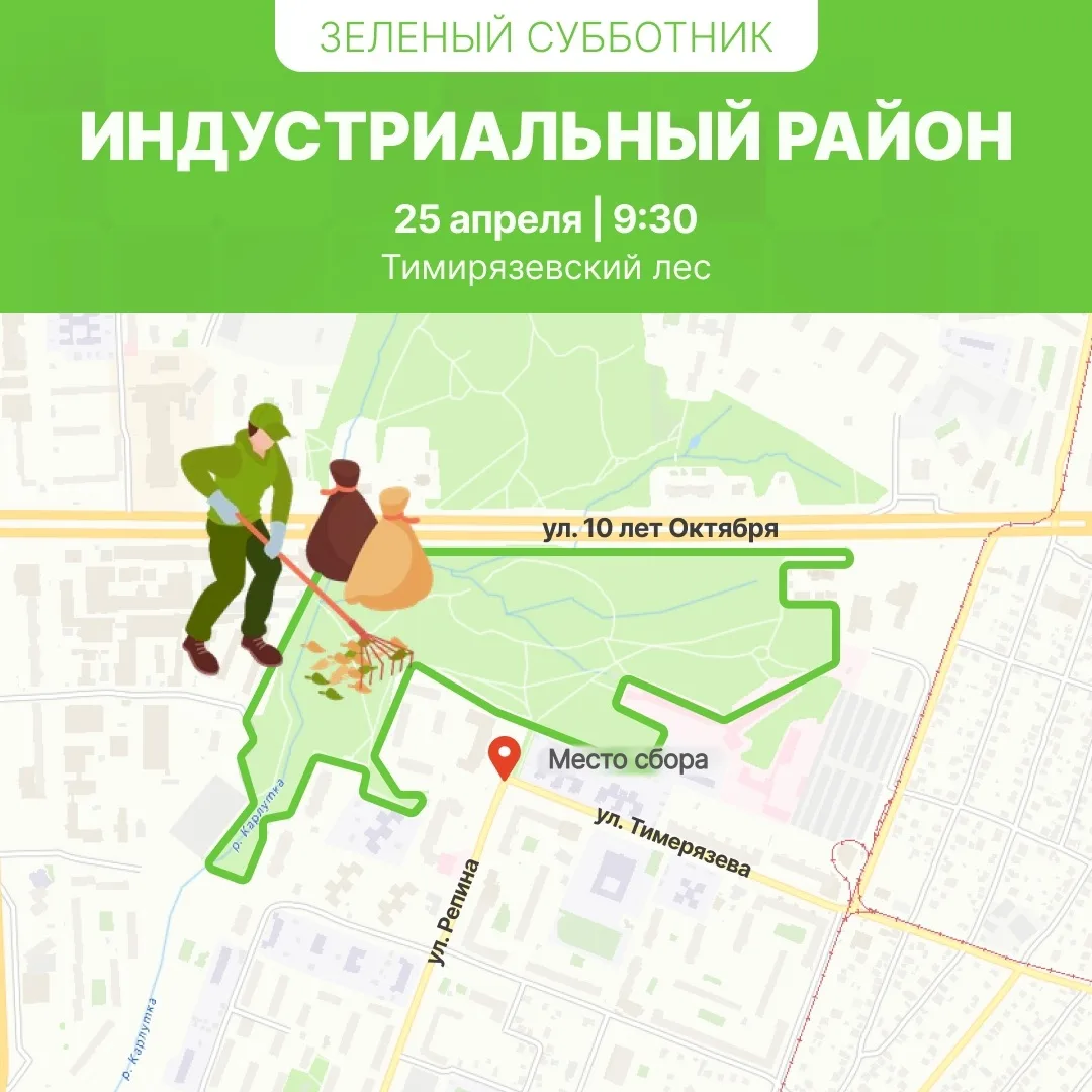 В Индустриальном районе в 09:30 начнется «Зеленый субботник» в Тимирязевском лесу. Сбор участников перед ФОЦ «Редуктор». В 11:00 - уборка на Северном кладбище.