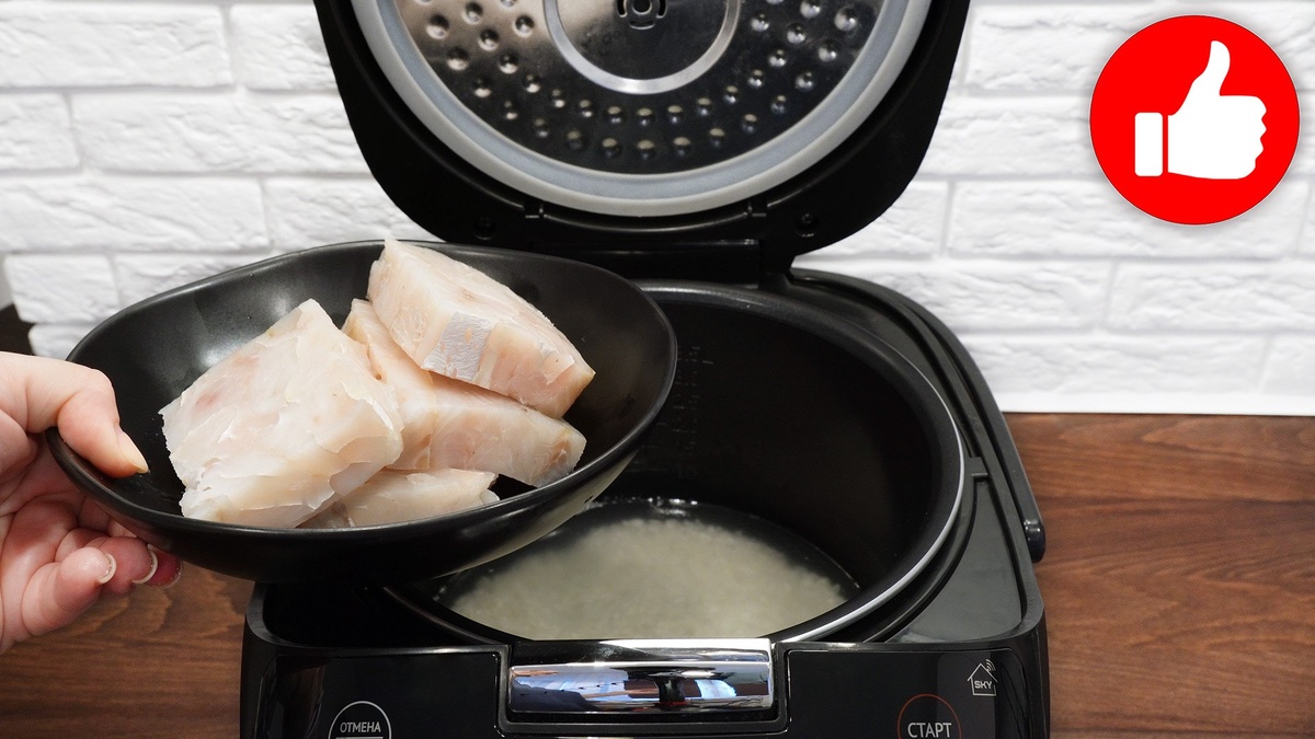1. В мультиварке на дно выложить промытый рис и добавить соль, затем залить его холодной водой. Наверх разместить рыбное филе.