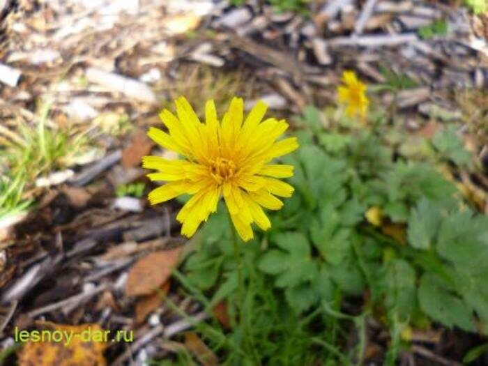 Это многолетнее растение с жёлтыми корзинками, содержащими обоеполые язычковые цветки. На фото оно действительно может напоминать одуванчик, но корзинки кульбабы осенней мельче, а количество цветков в них также меньше.